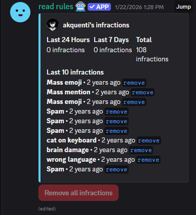 also he got 108 infractions (cn be warns, mutes watever rlly)